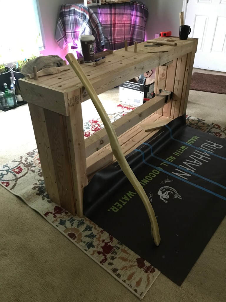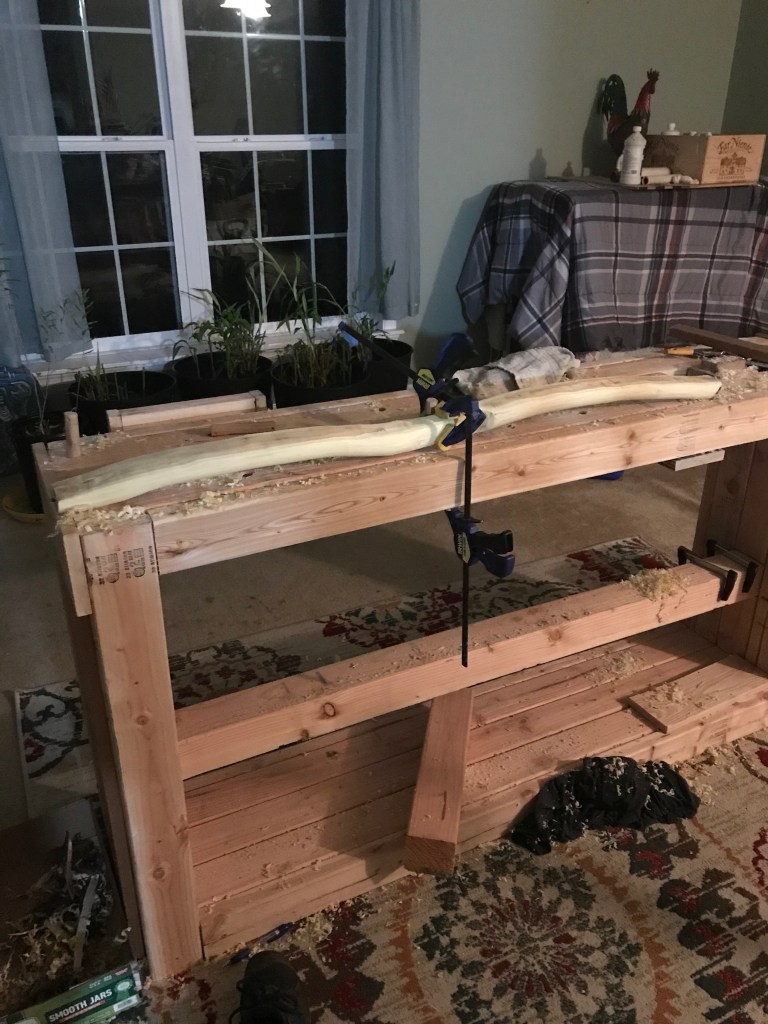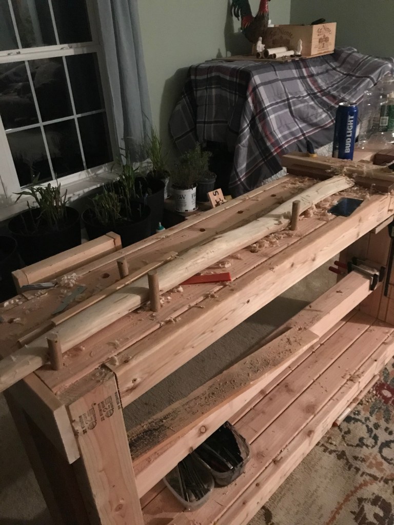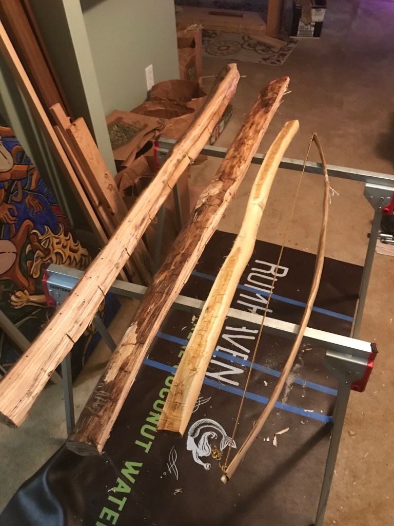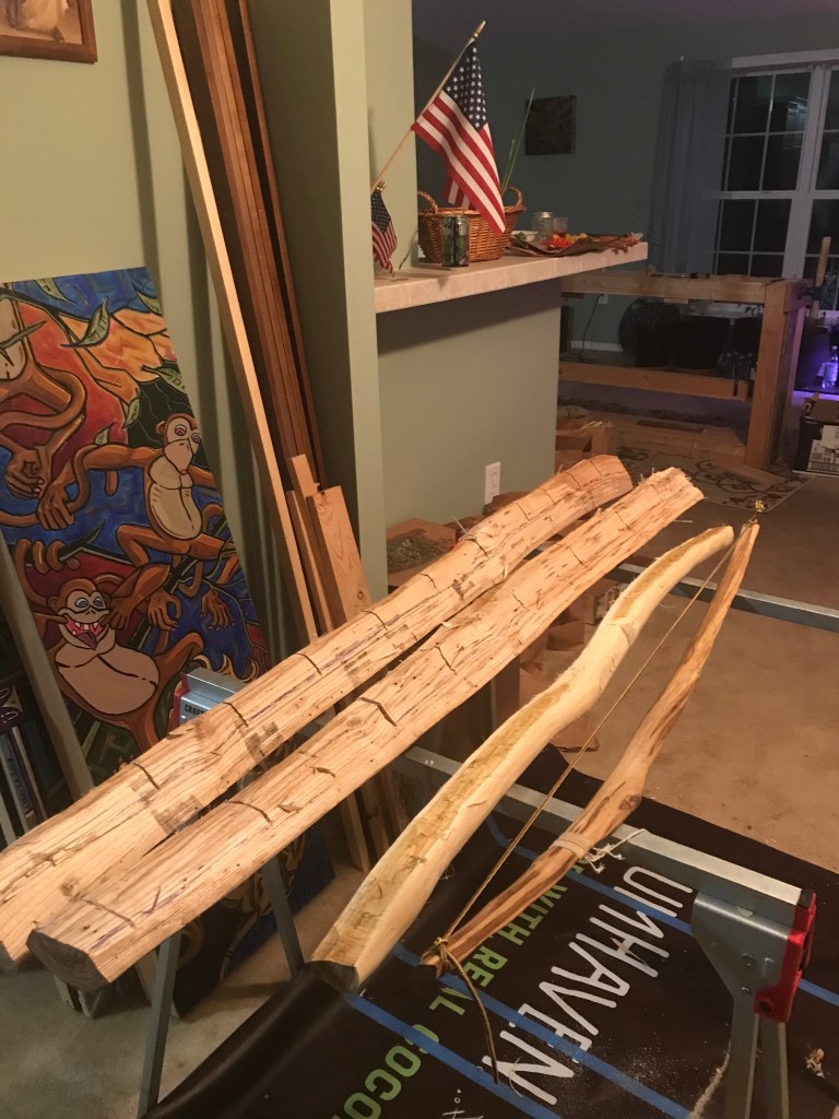 my Dad wrangled a peice of locust wood (yellow curvy guy) and i derived 2 staves from a downed maple (maybe) log (big straight beefy staves). The journey continues.ππΉ