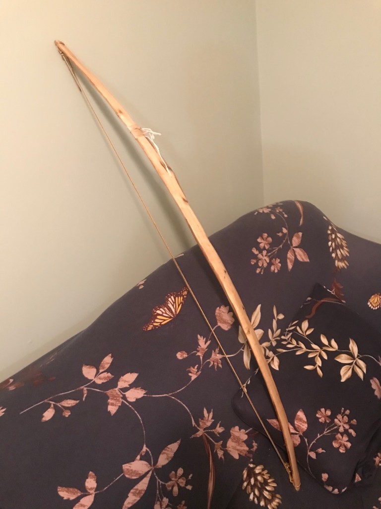 I finished my first successful bow, a 45 inch musclewood shortbow (self bow). The draw weight is between 20-30 lbs. it includes a repair made of cotton string and woodglue. This style would have been the first all-purpose bow adopted by all cultures. I name him βbaby sharkβ